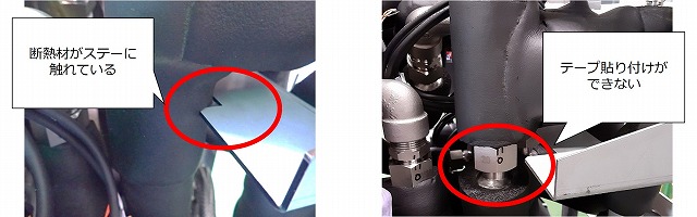 精密空調機器においては、断熱材を考慮して板金部品の配置や形状を設計することが、品質向上のポイントとなります。例えば、この事例ではステーの形状の設計を写真のように変更いたしました。このようにすることで板金部品が断熱材に触れることもなくなり、断熱材の破損に伴う品質トラブルを避けることが可能になります。また断熱材へのテープ貼り付けの作業性も向上することから、その観点でも品質トラブルを防ぐことができます。