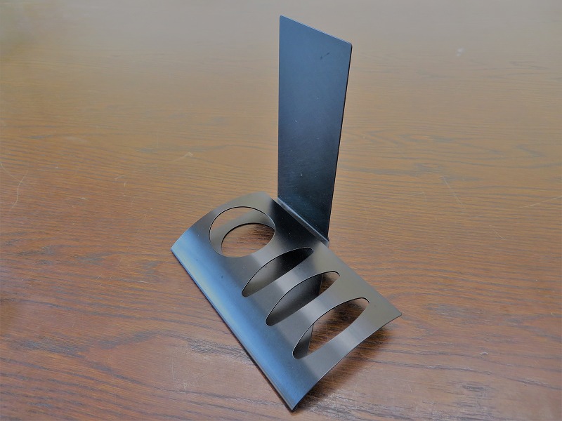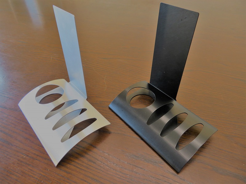 この品物は実験等に使用される部品となります。 材質はアルミ(A1050)で板厚は1mm、プレスで5工程経て完成します。 左がアルマイト処理前で、右が黒色アルマイト処理後の品物になります。