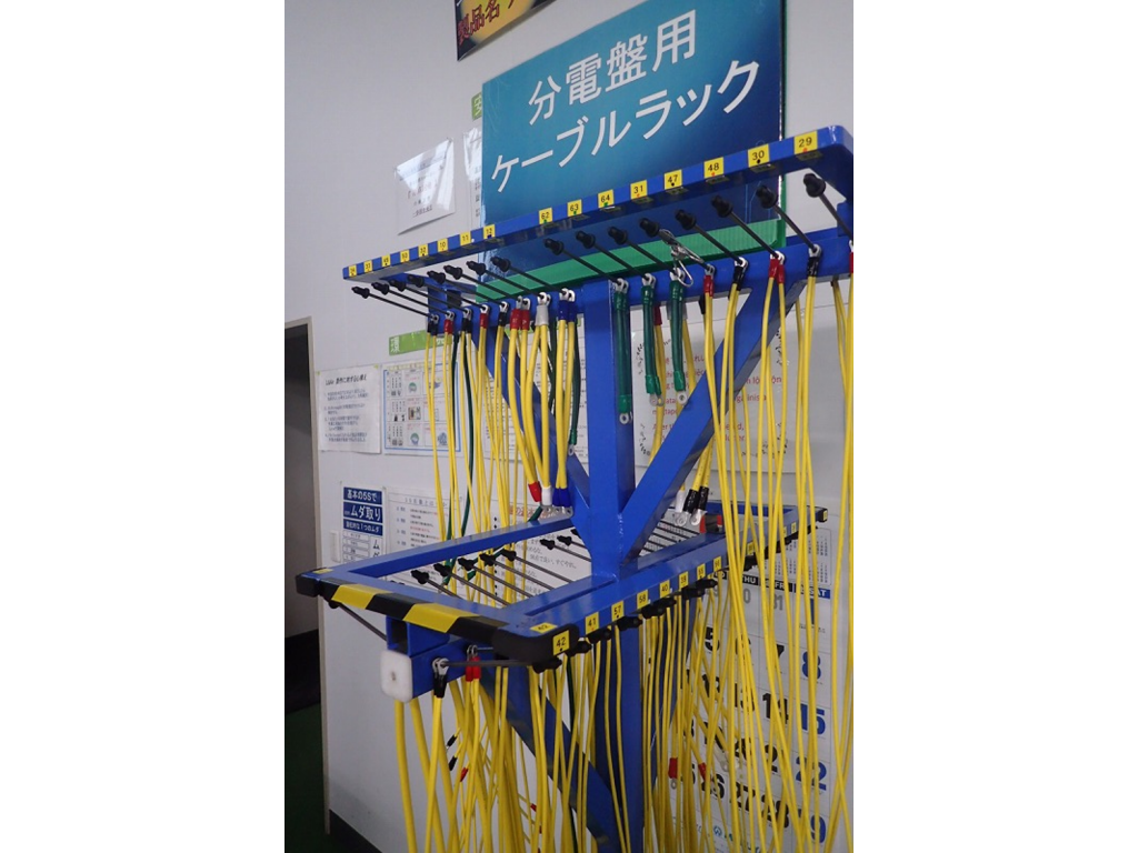 こちらの製品は電装作業のケーブルをまとめて管理するためのラックです。こちらのラック1つで10台分の製品を製作できます。以前は、テーブル(W90×L180)に配線順に番号を付けた線を並べ作業しておりました。現在は、圧着されたケーブルを、使用する順番に番号を付けて管理しています。ラック1つで、取付ミスの軽減、作業の効率化、員数管理、保管場所の削減を実現しています。