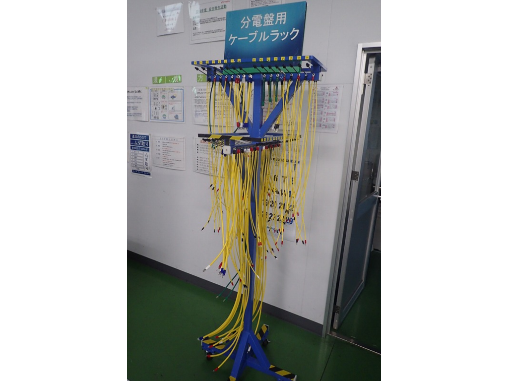 こちらの製品は電装作業のケーブルをまとめて管理するためのラックです。こちらのラック1つで10台分の製品を製作できます。以前は、テーブル(W90×L180)に配線順に番号を付けた線を並べ作業しておりました。現在は、圧着されたケーブルを、使用する順番に番号を付けて管理しています。ラック1つで、取付ミスの軽減、作業の効率化、員数管理、保管場所の削減を実現しています。