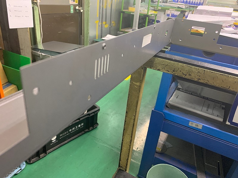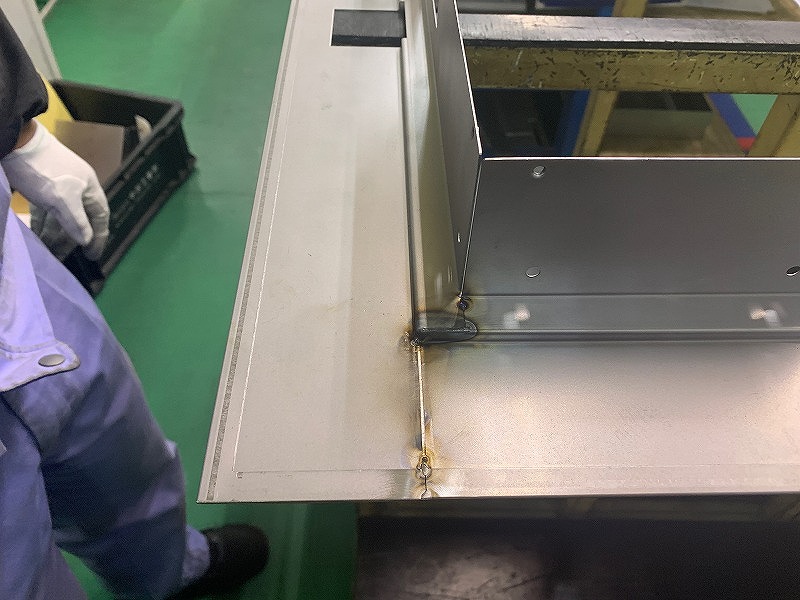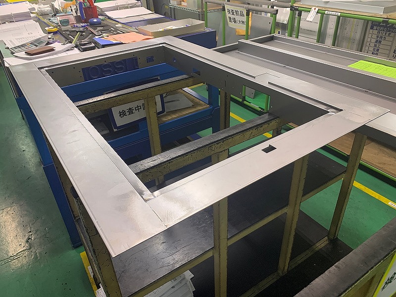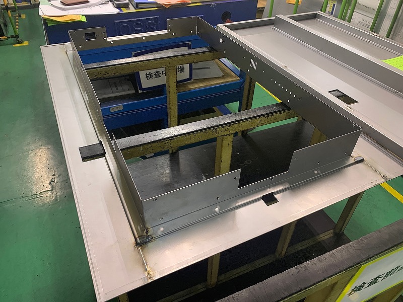 この板金は4点の部品で構成されており、それぞれNCTでの抜き工程と曲げ工程を経て、それを溶接にて結合させております。こちらのフレームは、後工程において、ディスプレイとの張り付けを行いますが、張り付け箇所に隙間が生じることはNGであるため、フレームの張り付け面は平面であることが要求されます。