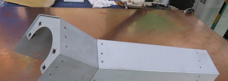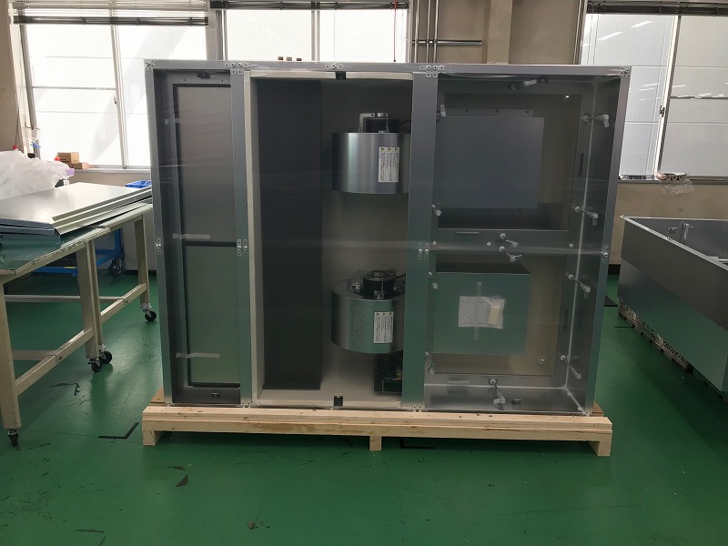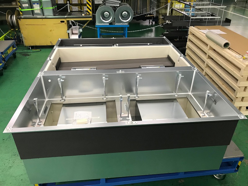 この写真の精密板金加工品は、バイオサイレントパック用ユニットと呼ばれる筐体として使用されています。バイオサイレントパックとはクリーンルームや手術室といった高いクリーン度が求められる環境下で使用される空調機器のことを指し、このユニットにHEPAフィルターをセットして実際に使用されます。