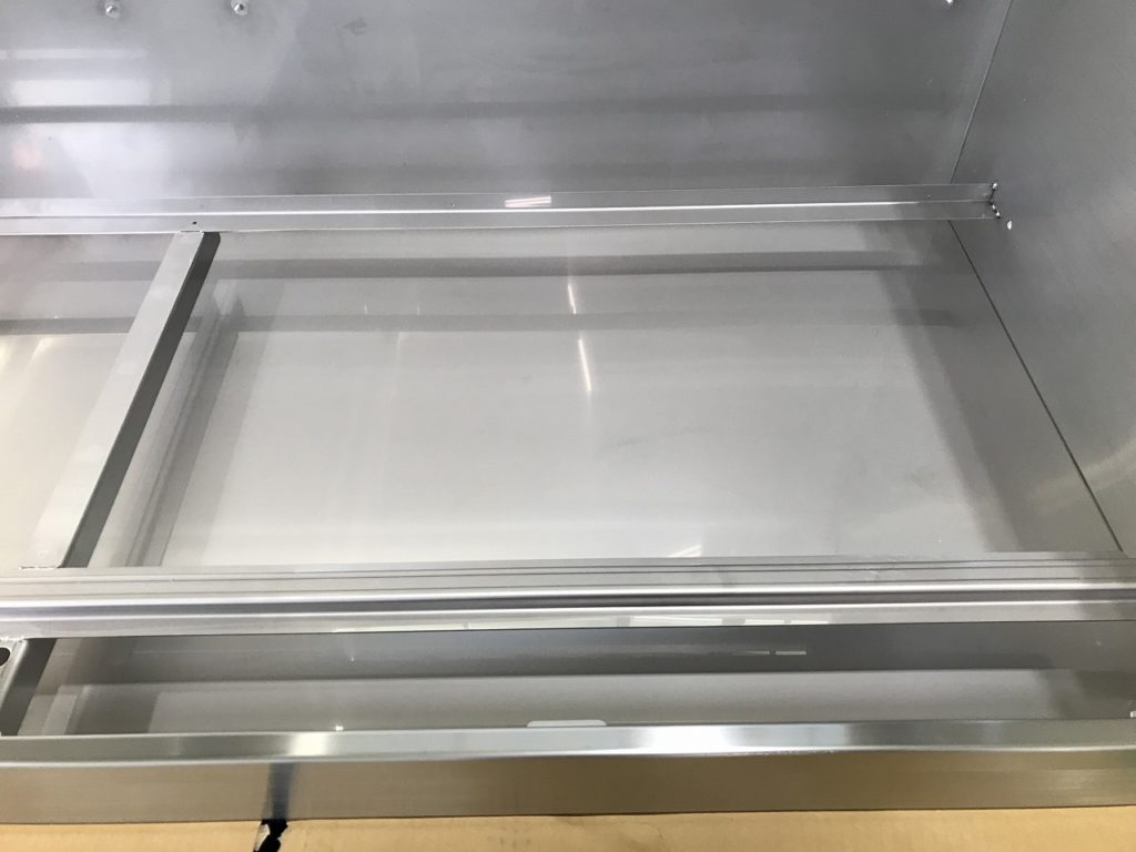 この写真の製品は研究施設で使用されるバイオハザード対策用キャビネットの筐体です。製造工程はレーザーで抜き加工を施したあと、ベンダー曲げ、スポット溶接、スタッド溶接、ヘアライン処理を行います。バイオハザード対策用キャビネットはバイオハザードを封じ込めるための装置となります。そのためこの筐体には高い気密性が求められます。そこで各工程については気密性を損なうことがないような加工を行うことが求められます。