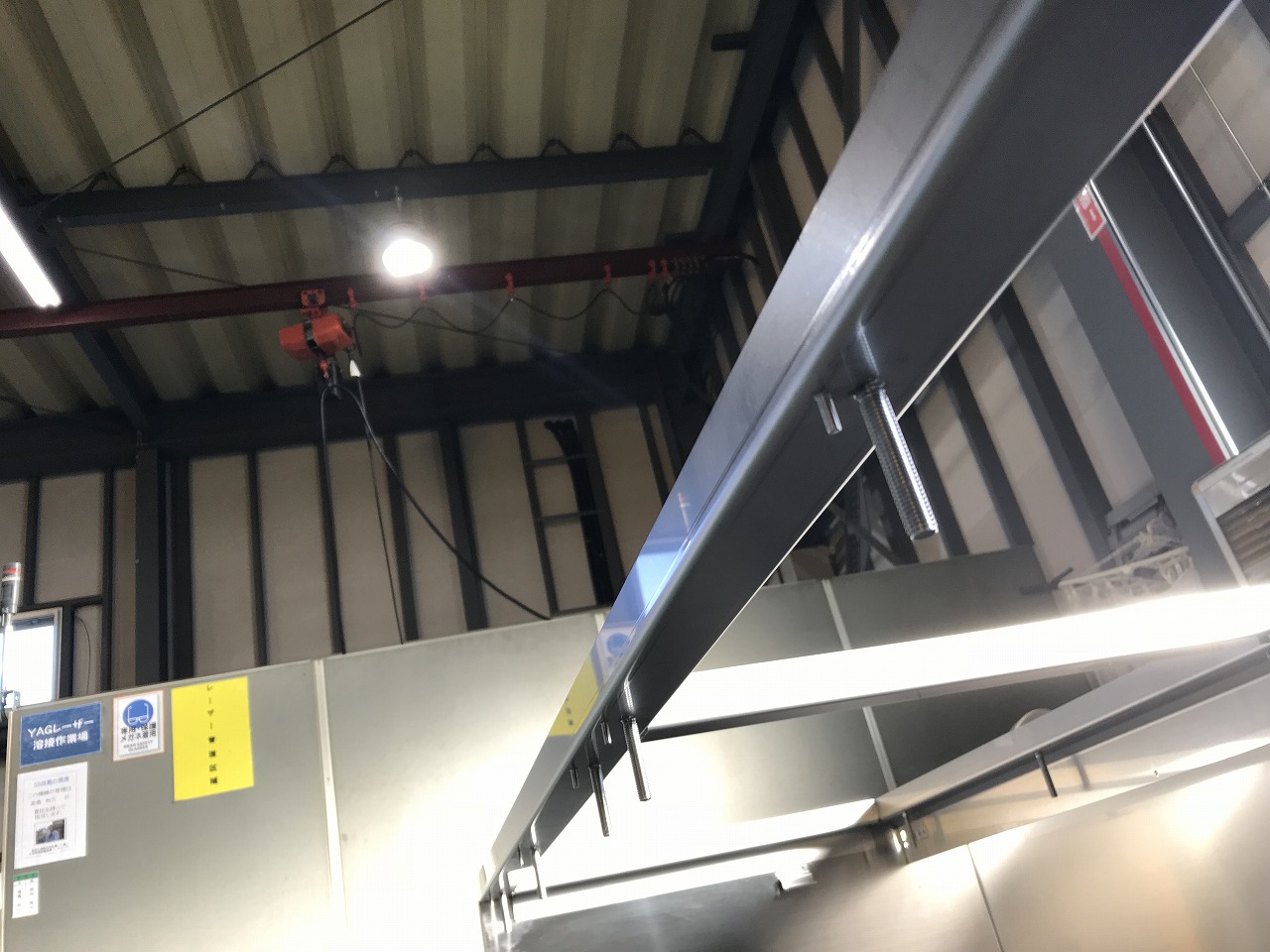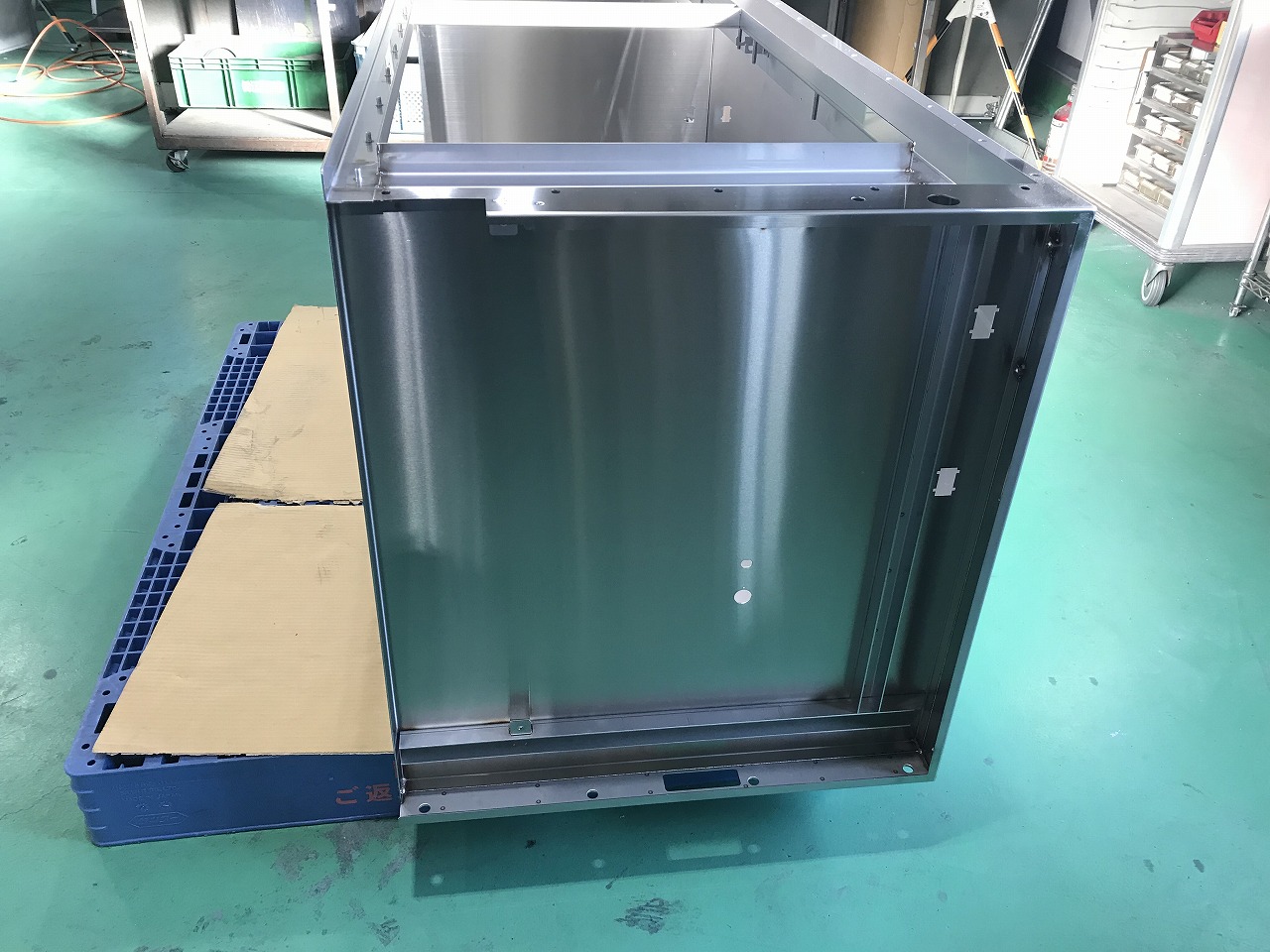 この写真の製品は研究施設で使用されるバイオハザード対策用キャビネットの筐体です。製造工程はレーザーで抜き加工を施したあと、ベンダー曲げ、スポット溶接、スタッド溶接、ヘアライン処理を行います。バイオハザード対策用キャビネットはバイオハザードを封じ込めるための装置となります。そのためこの筐体には高い気密性が求められます。そこで各工程については気密性を損なうことがないような加工を行うことが求められます。