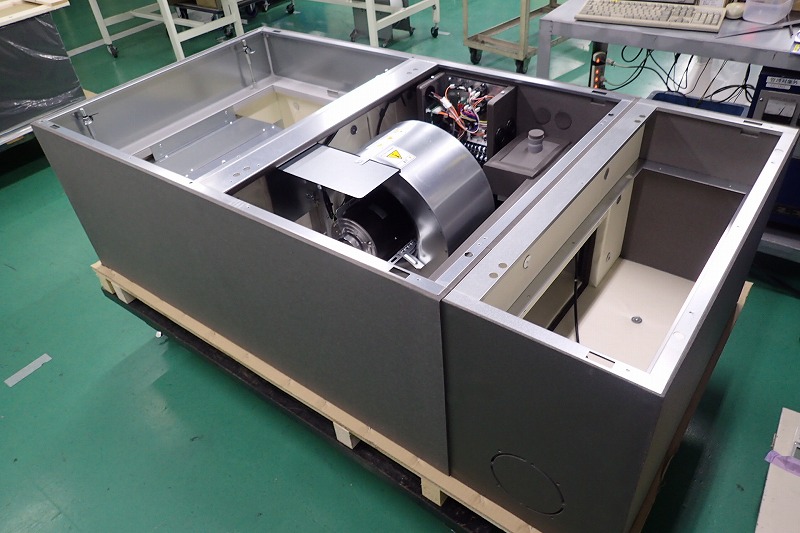 この製品の製造において、精密板金加工 配線組立.comでは、精密板金加工からビス留め、断熱材の貼り付け、データ入力、配線取付、動作確認(耐圧、風量、冷房、暖房、送風)、梱包までワンストップで対応しております。当社の精密板金加工の工程では、歪みなく溶接組付を行っています。ビス留め作業は、先に貼りつけられている断熱材に傷をつけ無いように、最新の注意・速さ・正確さを求められる作業と言えます。