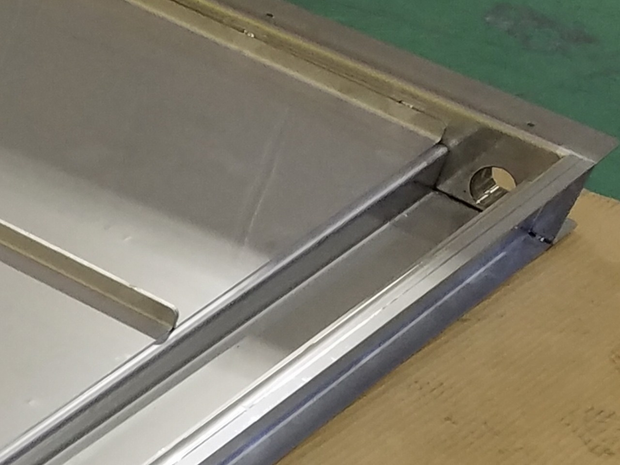 この写真の精密板金加工品は、精密板金加工 配線組立.comが製造している自動洗浄機械のドレンパンです。製造プロセスはファイバーレーザーでの抜き、曲げ加工、YAG溶接、焼け取りを施し製作しております。更にドレンパンという用途であるので、水漏れおよびそれによるサビや電気ショートを防止する為、溶接部分にコーキング処理を施しております。