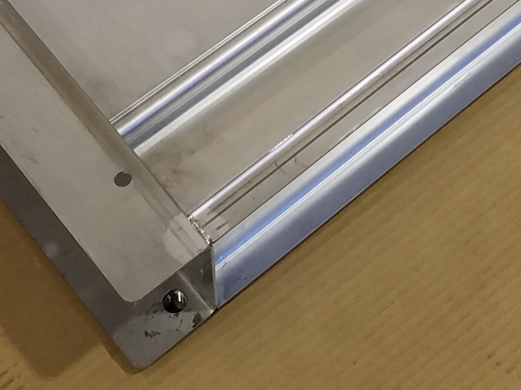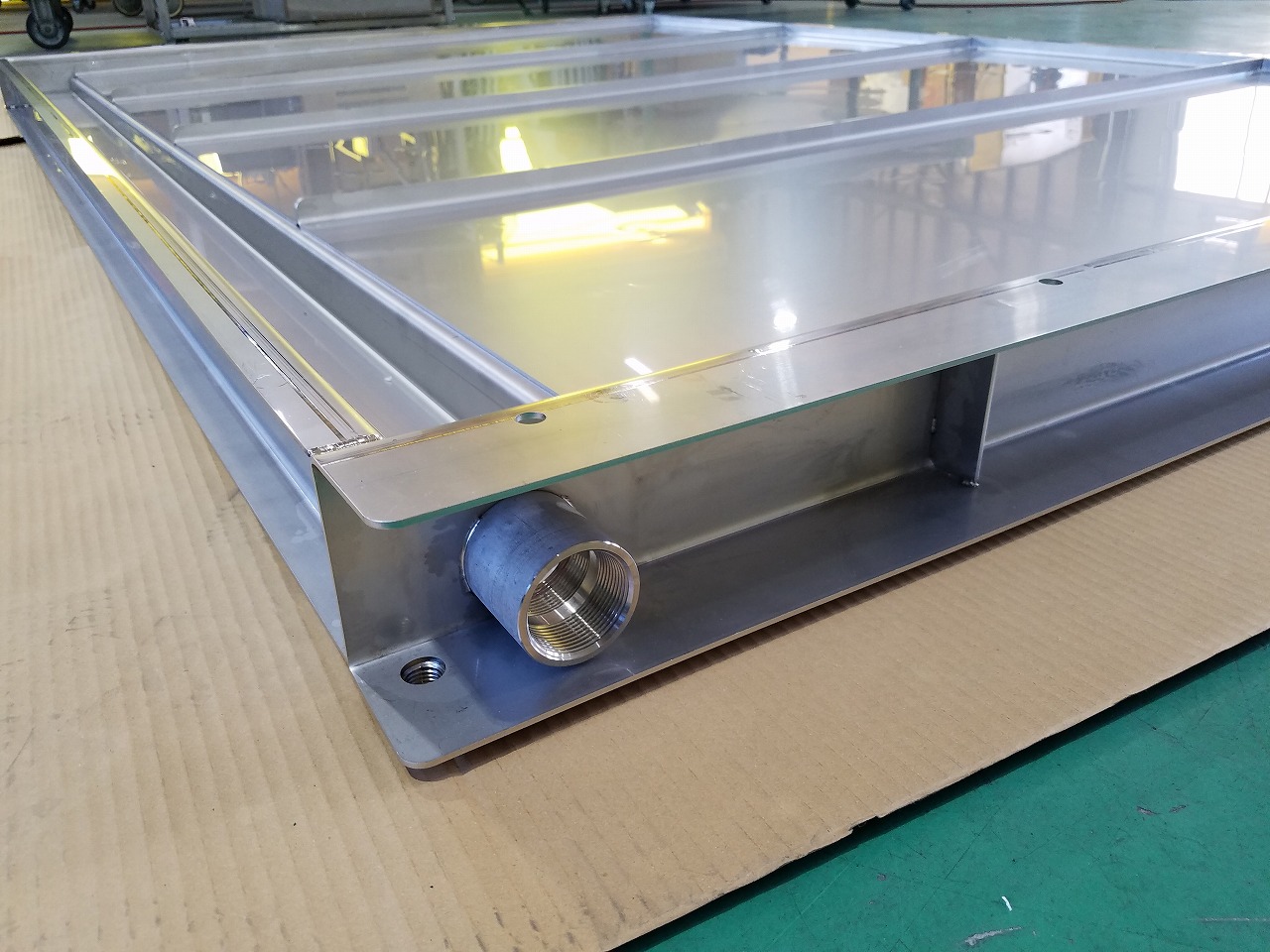 このドレンパンのサイズが2000*2000の大型サイズである理由としては、自動洗浄機械の使用用途が、車いす・歩行補助用具・マットレス等の医療・介護分野で使用されている介助用具を入れて稼働させるものなので、それに伴いドレンパンも大型化している為です。更に大型のドレンパンだと溶接時に熱による歪みが発生しやすいため、精密板金加工 配線組立.comではTIG溶接ではなくYAG溶接を行っております。当社では大型の精密板金加工品について様々な業界のニーズにお応えしておりますので、ぜひお問合せ下さい。