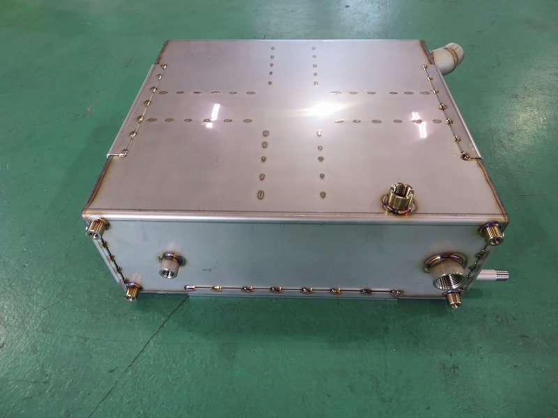 素材はSUS304で、ファイバーレーザー加工機にて抜き工程を行い、曲げ工程を経た後に最重要のTig溶接工程に入ります。 まずタンクの形状に組立溶接を行い、5点のソケットを位置ズレが無い様に溶接を行います。 タンクの中に2点の十字型補強ブラケットを、タンクの外側には5点のL字補強ブラケットをそれぞれ溶接します。 タンクの溶接に関しては全て水漏れが起きないように、そして歪みが起こらないように細心の注意を払いながらおこなっております。 なおこの後、溶接焼けの除去を行いますので、見た目にも考慮致します。また、こちらの製品は一番小さいサイズですので、その他の大型サイズにも対応致します。