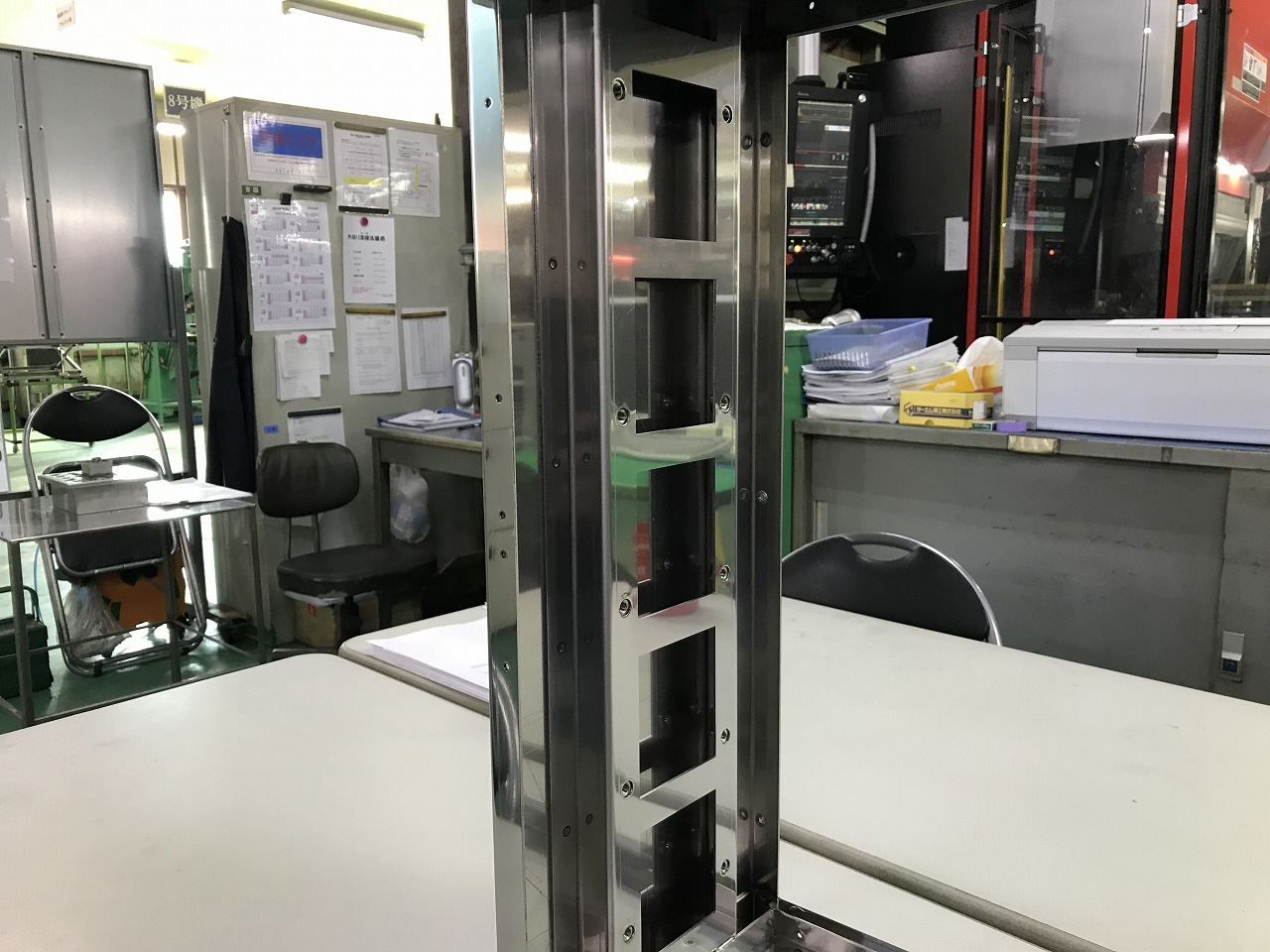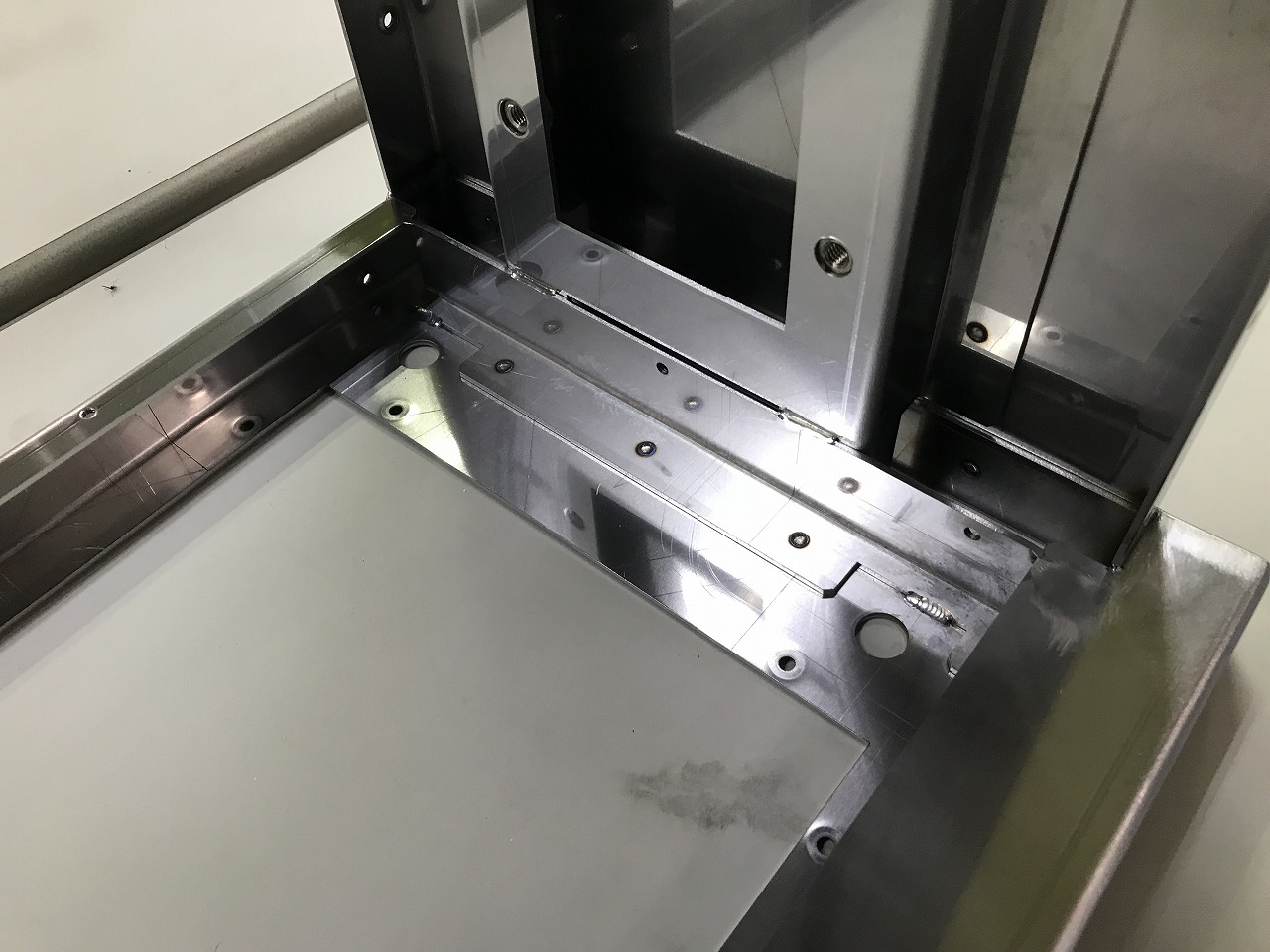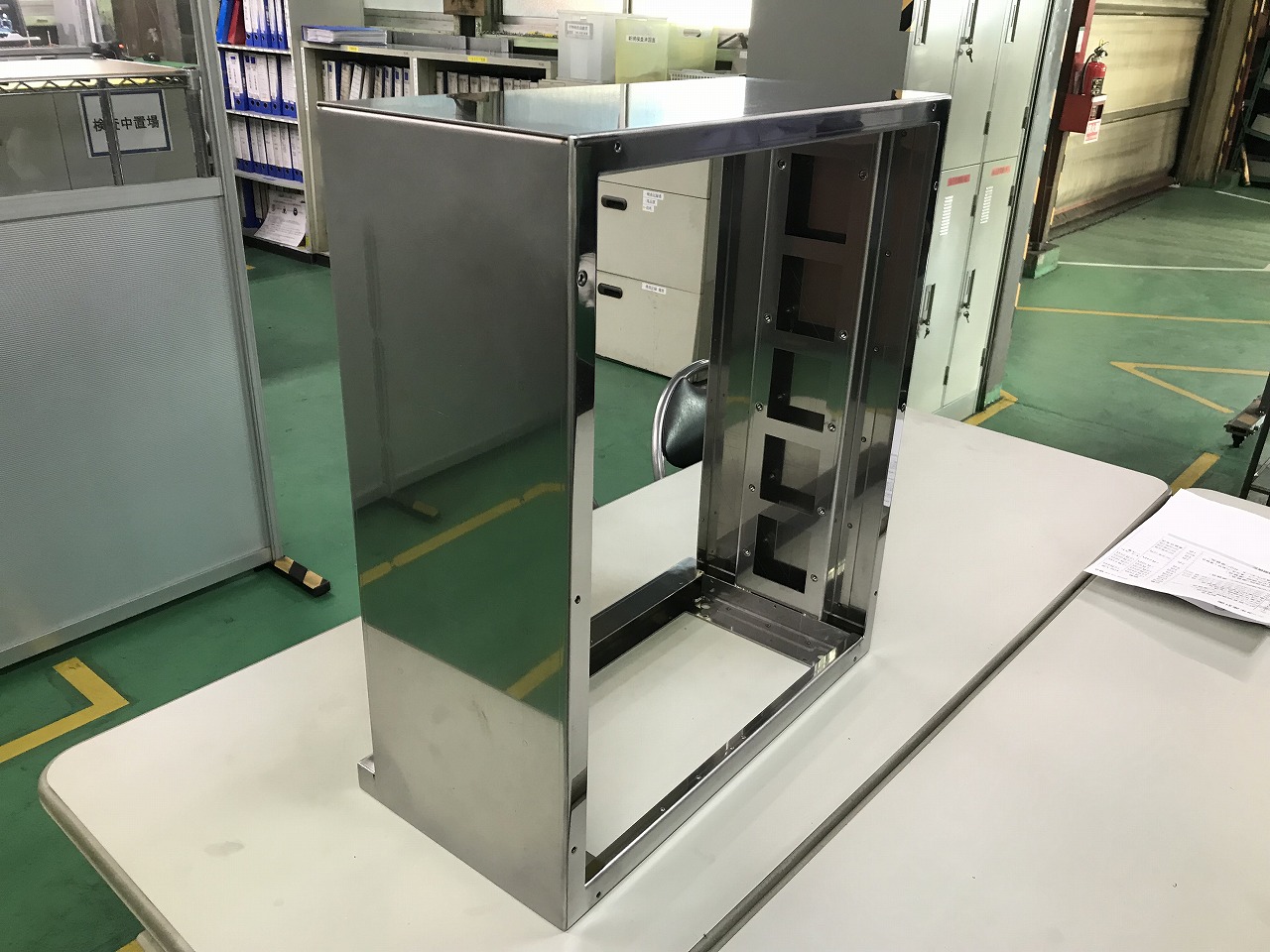 これは精密板金加工 配線組立.comが製作を行っている通信機器の制御装置フレームです。製作工程としてはファイバーレーザーによる抜き加工、曲げ加工、スポット溶接、鏡面処理を施しております。この制御装置のフレームの内側には精密板金部品がスポット溶接にて組付けられております。溶接による組付けにあたっては、フレーム内に電子基板、配線等の精密機器が入るためズレが許されず、その加工難度は高いと言えます。