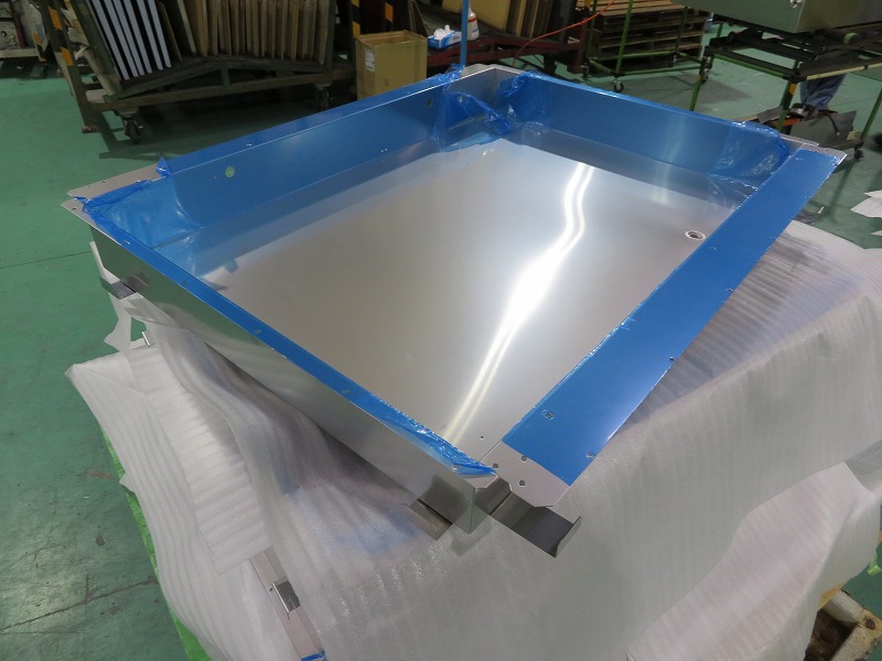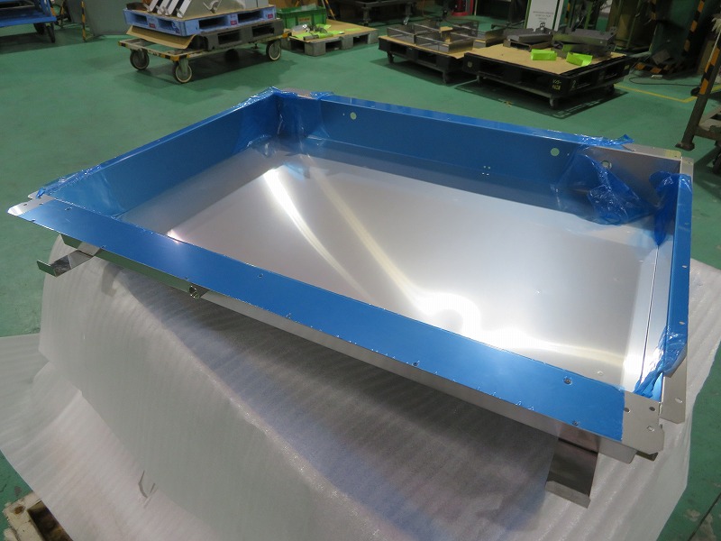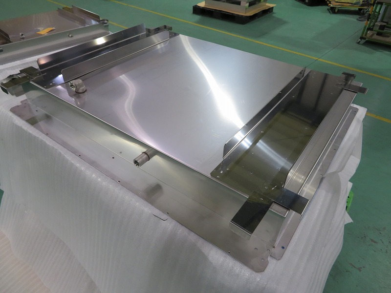 この商品は医療・バイオ機器に使用される底板部のASSYになります。 材質は脚部が板厚t1.0mmとt2.0mmのSUS430、箱部がt1.0mmのSUS304になっております。この材質の使い分けの背景としては、SUS304のほうが耐食性に優れる一方でコストもその分上がりますので、ドレンを受ける箱部はSUS304を適用、比較的耐食性は必要とされない脚部はSUS430を適用しております。