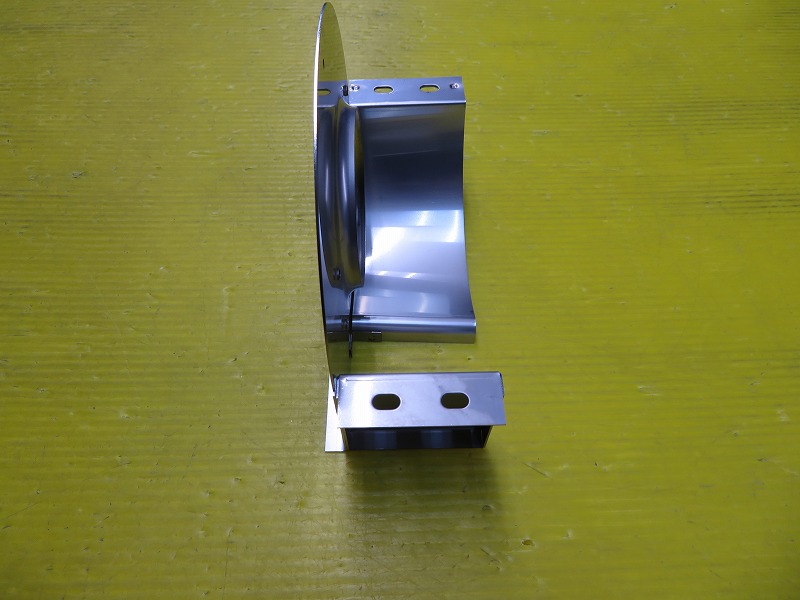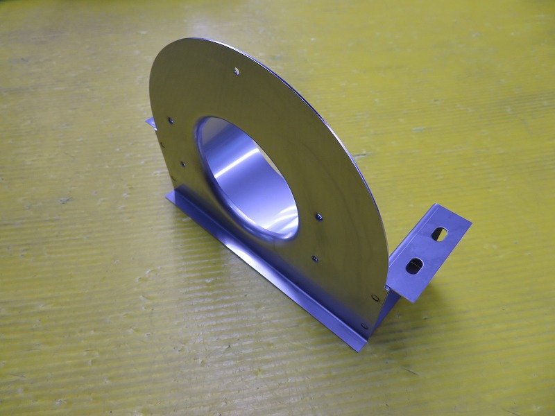 製作工程としては、まずファイバーレーザー加工機を使用して抜き加工を行った後、カバー部の部品はプレスにてバーリング加工を行って形状を出しております。一方、受け部の部品はロールベンダーにて曲げ加工を行い、FR曲げとは違う滑らかな曲面加工にしております。そして4点をスポット溶接にて組立てを行い完成となります。見た目はシンプルな製品ですが、医療機器に使用される部品ですので曲面等精密な板金加工を行っております。