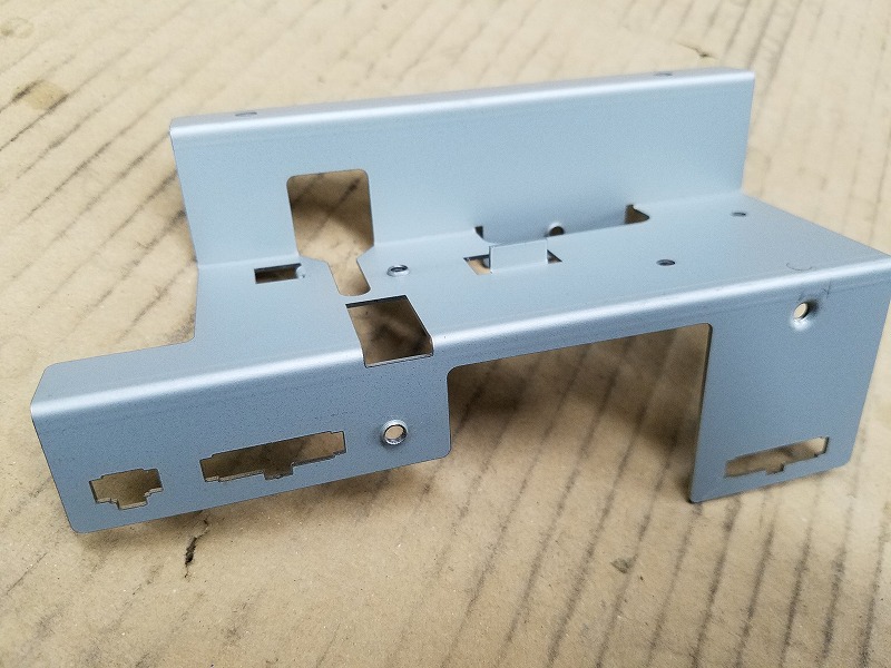 この基板はタレットパンチによる打ち抜き加工および曲げ加工が施されています。特に曲げ箇所は複数ありますが、曲げ方向が箇所により異なります。そこで精密板金加工 配線組立.comではステップベンドを用いて、1つのベンディングマシンで異なる曲げ方向に加工できるようにしております。そのため複数のベンディングマシン間でのハンドリングが不要で、工数を抑えた曲げ加工を実現させております。