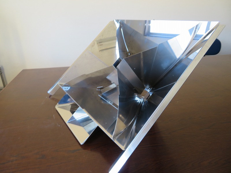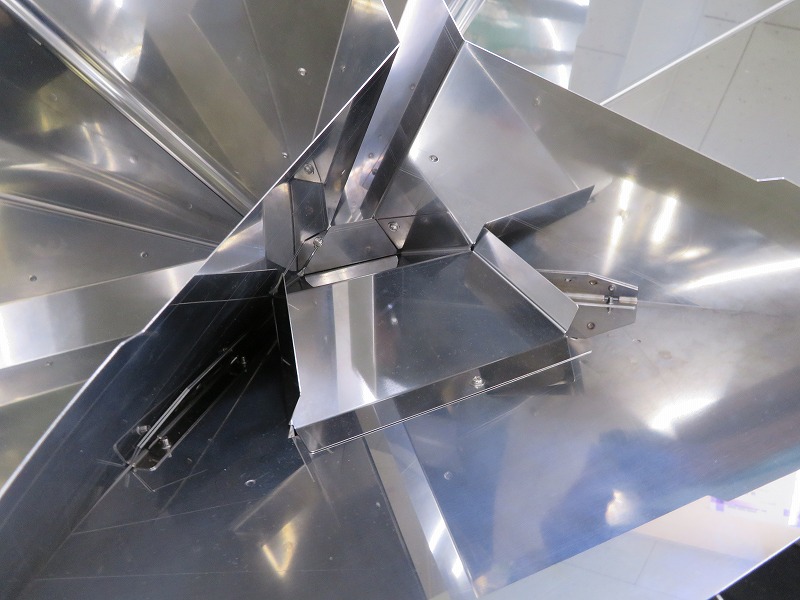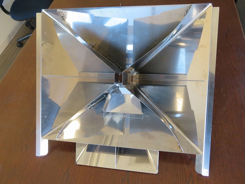 四角の口の部分が下になって漏斗のように使用されるもので、集められた薬などが詰まったりしない様に 内側部分はカーブがついている特殊な形になっており、組立を行うのに精度が求められます。 素材はSUS430で部品は都合13点で構成されており、外側の部分はスポット溶接にて組立を行い、内側についてはネジ止めで形状を作っています。 加えて、こちらの製品は医療用途の製品になりますので、バリ等が発生しないよう、品質には細心の注意を払って製作を行っております。