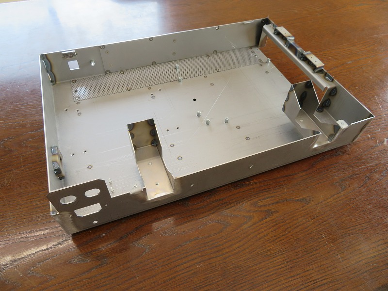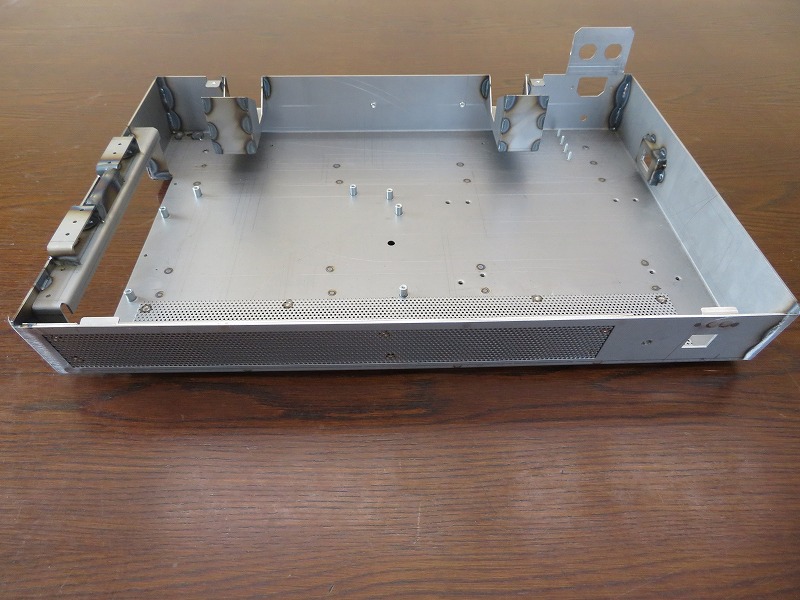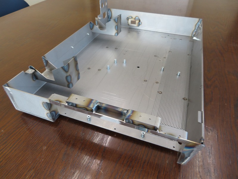 材質はSPCCで、取引先納品後に塗装処理が施される仕様となっております。 写真を見ての通り、圧入部品が多く使われており全部で5種類使用しています。(ナット2種・クリンチングスペーサ2種・クリンチングスタッド1種) 部品としては6点の部品で構成されており、補強になる部分はスポット溶接、相手側の受けになる部分はTig溶接にて組立を行っております。 パンチングメタルは大きさの違う2枚を使い、通気用と表装用をそれぞれスポット溶接にて取り付けています。