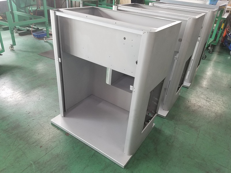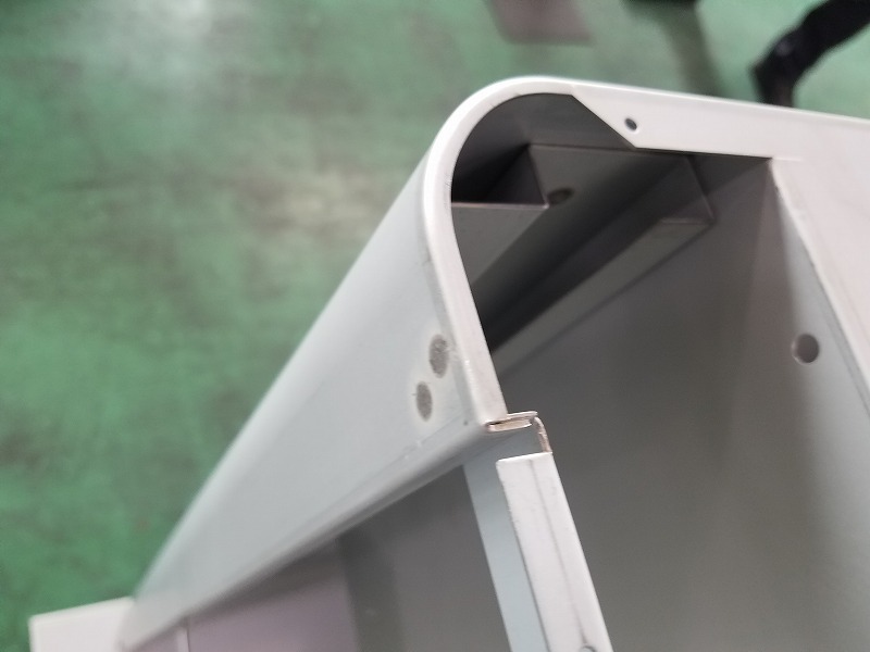 これは卓上式のメリクロンクリーンベンチ用の外装部品です。メリクロンクリーンベンチとは植物バイオ実習、園芸生産などに使用される園芸バイオ機器のことです。 精密板金加工 配線組立.comでプレス加工、曲げ加工、スポット溶接、ビス止め、溶接を行って製作しております。角部のR形状は専用型を使用することで綺麗なR形状を形成しております。また内部の小さい部材はスポット溶接で取り付けておりますが、スポット溶接後にそのまま塗装を行うと、塗装後にスポット溶接起因の打痕が目立ってしまいかねません。そこで溶接後に仕上げまで行った上で塗装を行うことで、外観上の問題をクリアしております。また底面部分と上部の筐体部分はスポット溶接にて接合しておりますが、底面は板厚が厚い金属を使用している一方で、筐体部分は板厚が薄いものを使用しております。そのため、筐体部分の金属が溶けすぎず、かつ底面部分は十分に溶かせるような条件下でスポット溶接を行う必要があります。島田工業株式会社では熟練の溶接技術により、その要求を満足させてきております。 高い外観品質が求められる筐体・外装品についてはぜひ一度精密板金加工 配線組立.comへご相談ください。