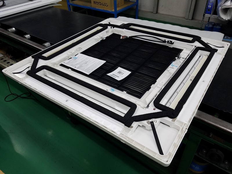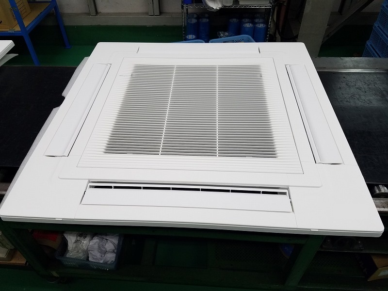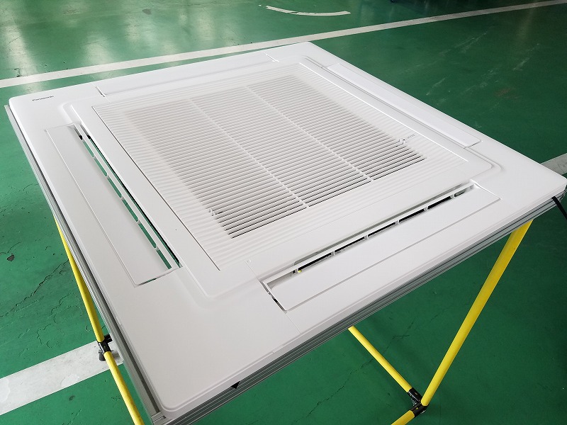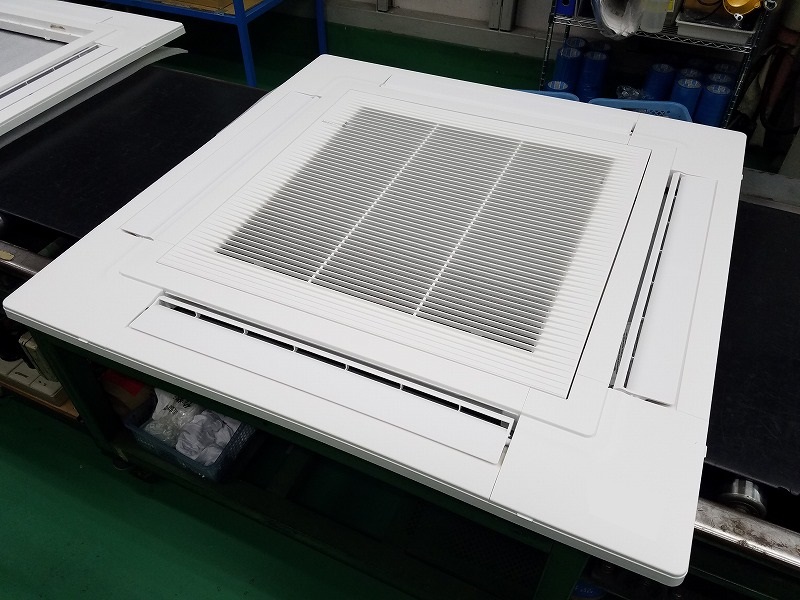 この写真はビルや店舗など業務用で中心に使用されている、室内埋め込み型エアコンの四方向カセットパネルです。4つ設けられている吹き出し口からから風が出るものとなっています。
