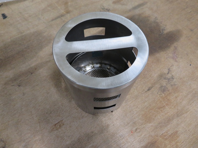 この製品は抜き・曲げ・溶接の3工程で製作しております。まず抜き工程において、メッシュ材ではNCT加工機で、他の部品はファイバーレーザー加工機で加工するというように部品ごとで分けて抜き工程を行っております。続いての曲げ工程では、まず鼻曲げ加工を行ったのちに3本ロールベンダー機にて円筒状に加工します。溶接工程では、上下の蓋部にはそれぞれスポット溶接を施し、一方で円筒の結合箇所には水漏れや回収物の漏れが無い様にTIG溶接を行ったあと、蓋部と円筒部をTIG溶接および仕上げを行っております。組み合わせて使用するものですので無理なく重ね合わせることが出来る様に溶接時には細かい調整も必要となります。