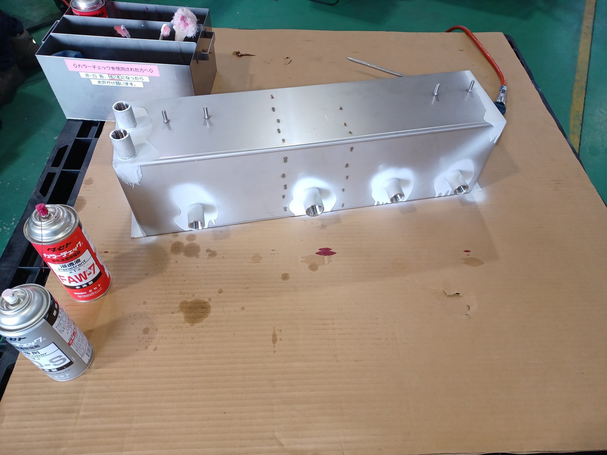 また、以前は油性のスプレーを使用しておりましたが、検査後の洗い流しの際に、溶接箇所や穴に付着物が残る懸念があったため、当社では水性のカラースプレーを使用しています。