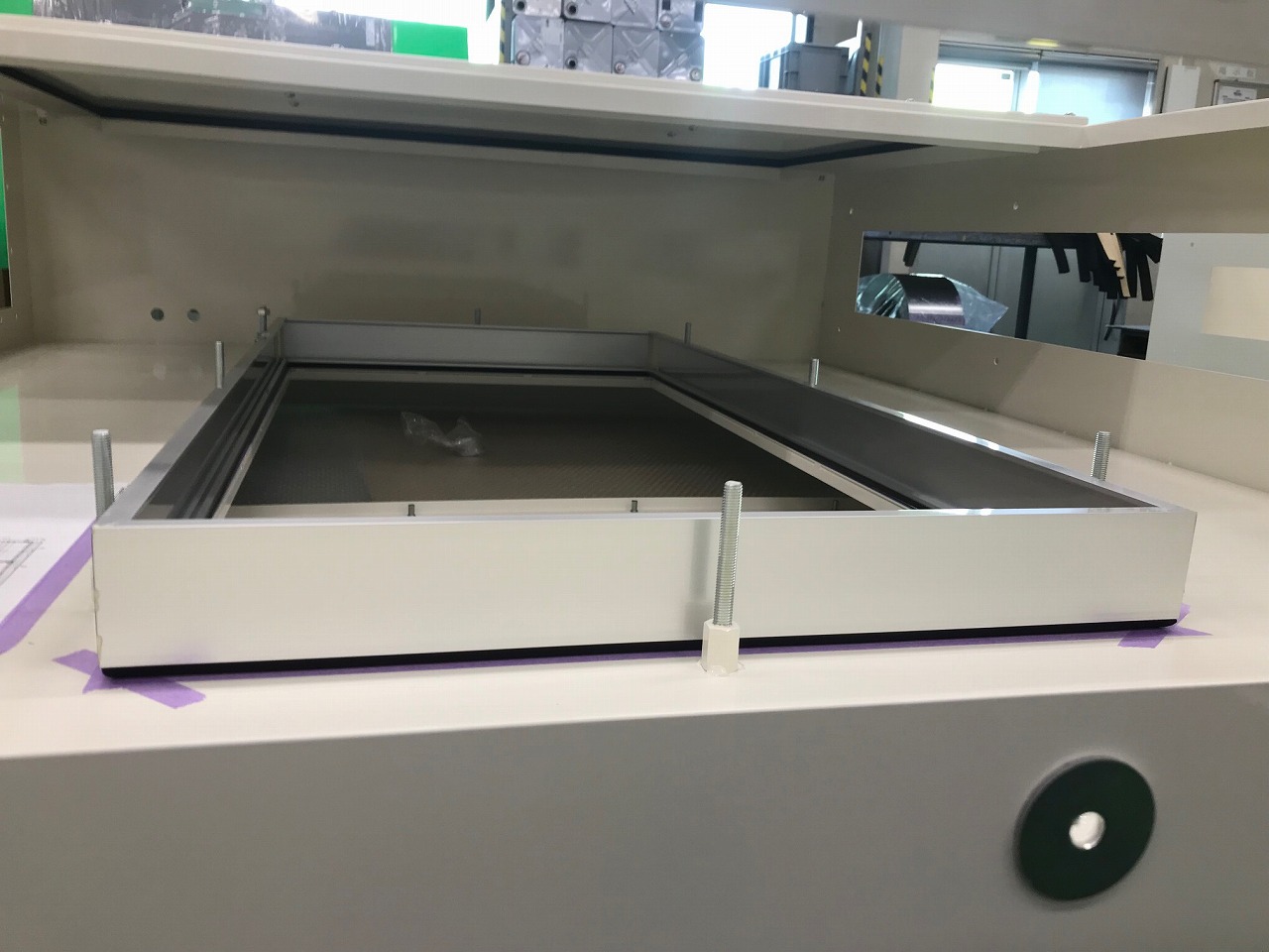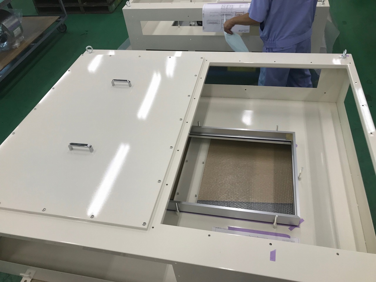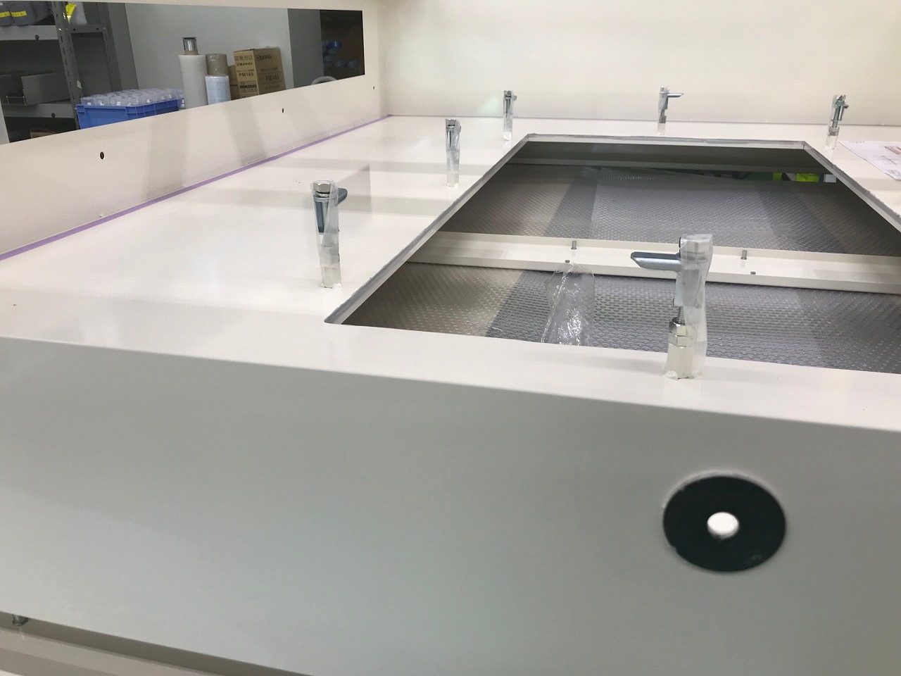 この精密板金加工品は、工場内にて使用する産業用クリーンエア供給ユニットの筐体です。こちらの筐体にある中央部の四角穴部分は高性能HEPAフィルターを取り付けることができますが、取り込んだ工場内の汚れた空気を、このHEPAフィルターを通すことでクリーンな空気を供給できるような構造になっております。