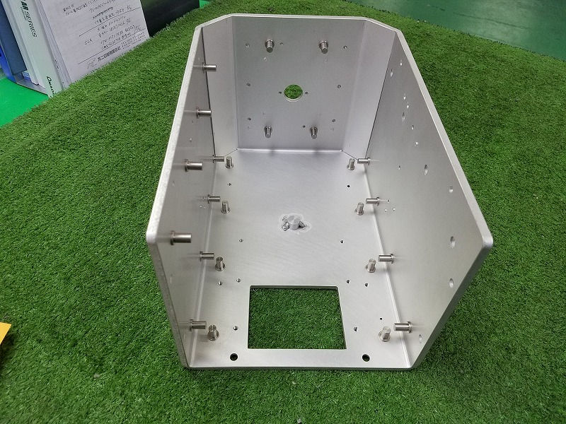 この写真は、監視カメラを格納するアルミ製の筐体です。材質はアルミで、ファイバーレーザー複合機による穴あけや曲げ加工、TIG溶接、アルマイト処理、カシメを精密板金加工 配線組立.comで行っております。