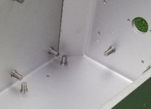 この筐体に使用するアルミはt:5.0となっているため、ファイバーレーザー複合機にてブランク加工を行っております。またカシメを深いところに打つことも要求されます。そのため精密板金加工 配線組立.comでは自社で開発した特殊な治工具を用いて、加工困難な箇所にもカシメを打つことができるようにしております。
