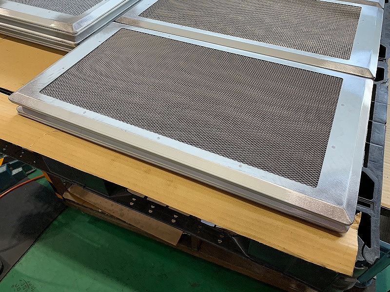 こちらの製品は空気清浄機フィルター部分の部品となっております。こちらの製品の製作依頼が来た段階では、4つの角部について図面通りの製作が難しい状態でしたが、図面上では1つになっている部品を3点に分けることを設計段階から提案・製作することで、お客様もご納得頂ける製品となりました。アートメタルは客先からの支給で、その他の枠部と角を構成する小さい部品2点はNCTにて加工し、ベンダーにて枠部の曲げと小さい部品はR曲げを行い図面に沿った角部のR形状を作り、枠を組み合わせた後に角部に小さい部品2点をはめ込み、それぞれTig溶接を慎重に行い仕上げ処理をします。そしてその後、アートメタルをスポット溶接で16点溶接して完成となります。