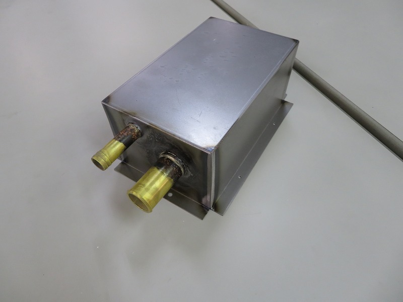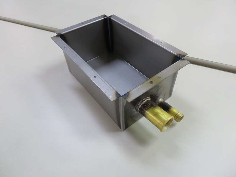 一見、見た目はシンプルですが、工程が多い製品となっております。具体的には、はじめにNCTでの抜き加工・プレスでのバーリング加工・曲げ加工にて箱形にします。それから、4角に対してTig溶接加工し仕上げを行い、その後に、2種類の真鍮製パイプをろう付けにて接合します。 最後にカラーチェックにて水漏れ等が無いか検査を行い、完成となります。