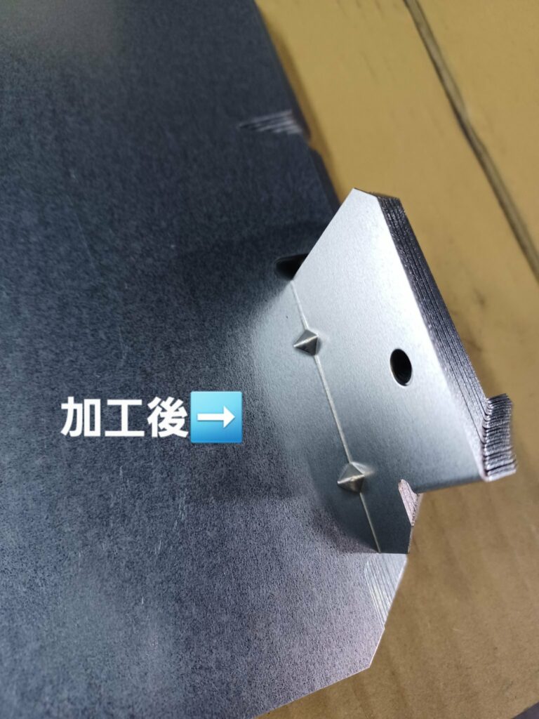 加工工程としては、タレットパンチプレスで抜き作業の後、曲げ加工を行いました。今回、曲げ加工を行う際に、専用の金型を使用することでリブ加工と曲げ加工を同時に行いました。これにより工数削減を実現しております。