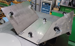 こちらは、筒形溶接組立用台車の製作事例です。この台車は筒状のものを溶接する際に、使用しています。