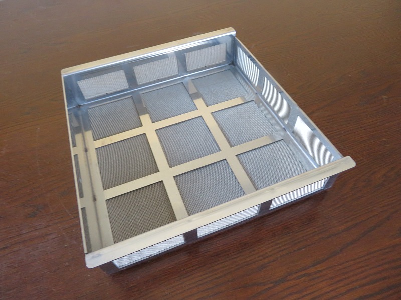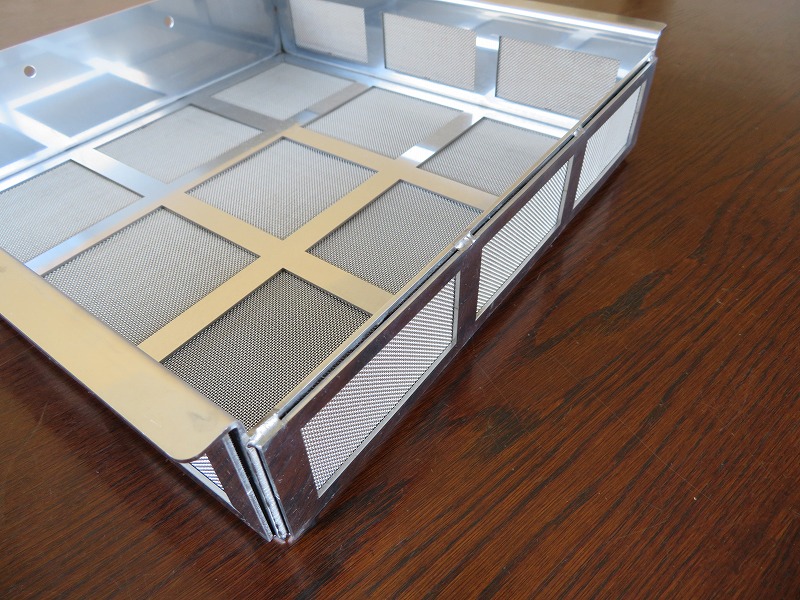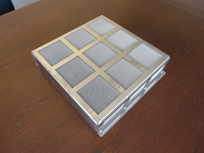 ファイバーレーザー加工機にて抜きを行った後、箱型に曲げた土台部に3種類のSUSメッシュをスポット溶接し、