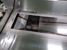 脱脂洗浄機の水が洗浄槽からタンクへ流れこむ部分の溶接をしております。水が抜ける場所ですので水漏れが起こらないように慎重に溶接を行わうことが、この製品のポイントです。