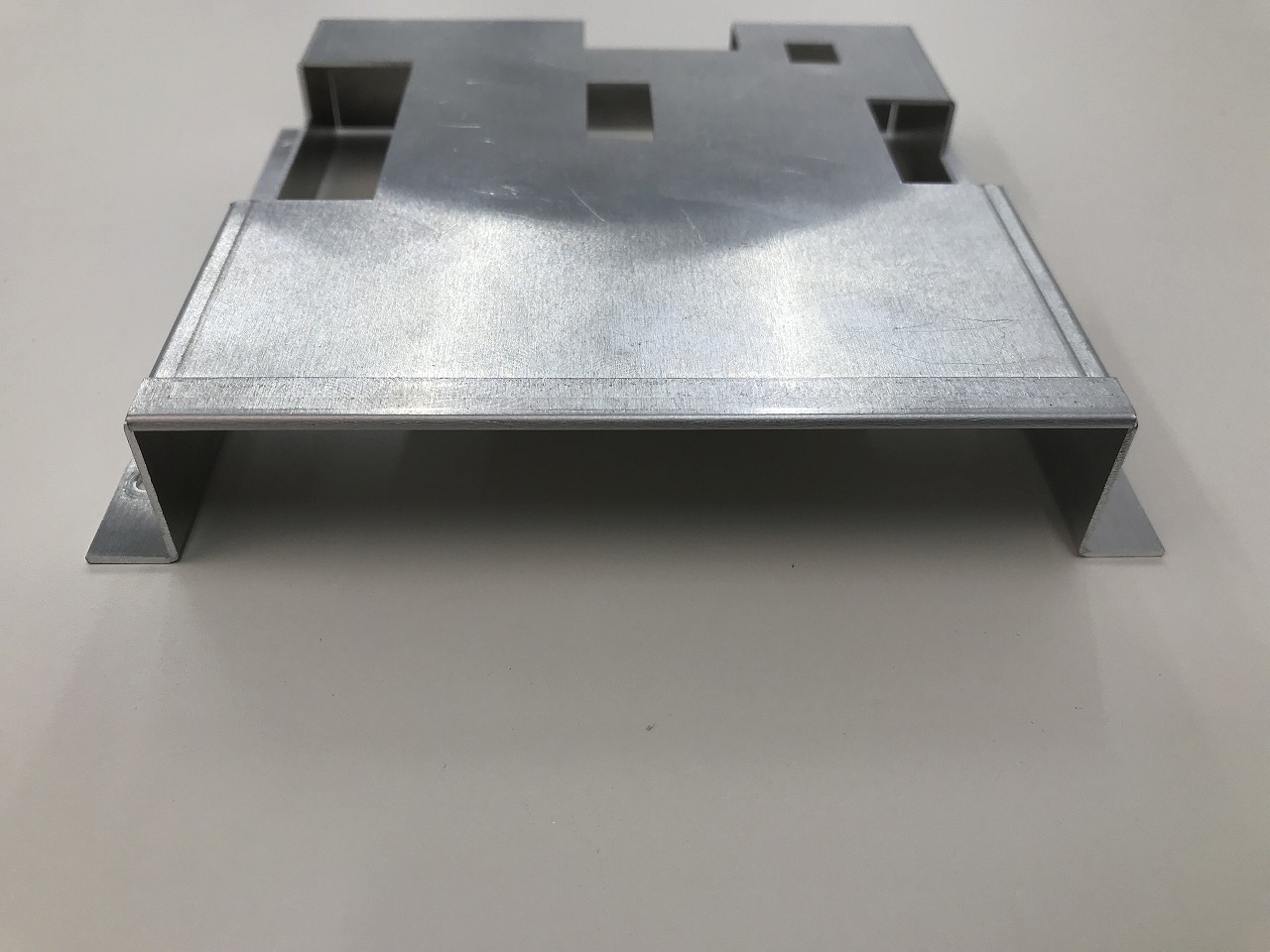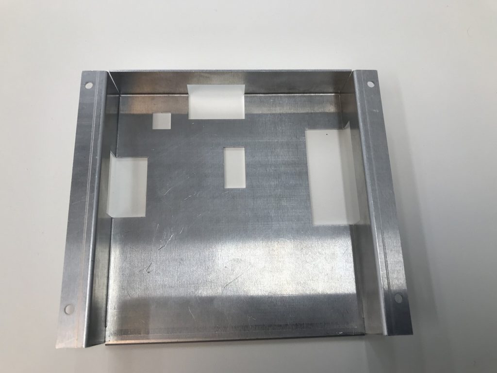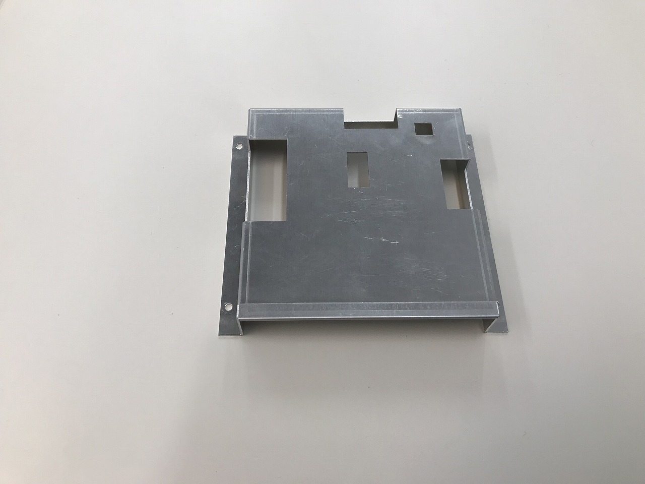 この精密板金加工部品は、自社製品のシーリングライトの電源基盤カバーです。製造工程として、ファイバーレーザー複合機による穴あけ、ベンダーによる曲げ加工を行っております。この部品は製作後、シーリングライトの組立部品として島田工業の組立工場へ送られます。このシーリングライトは空気清浄機の複合機能が付随しており、組付ける配線も複雑である為、板金部品と接触することで配線に傷が付くと、シーリングライトの機能が正常に働かなくなる危険性があります。