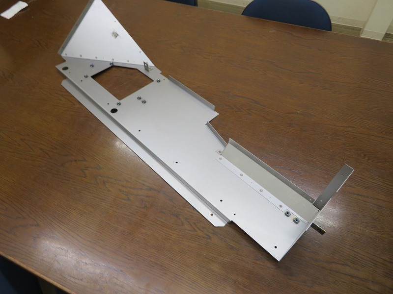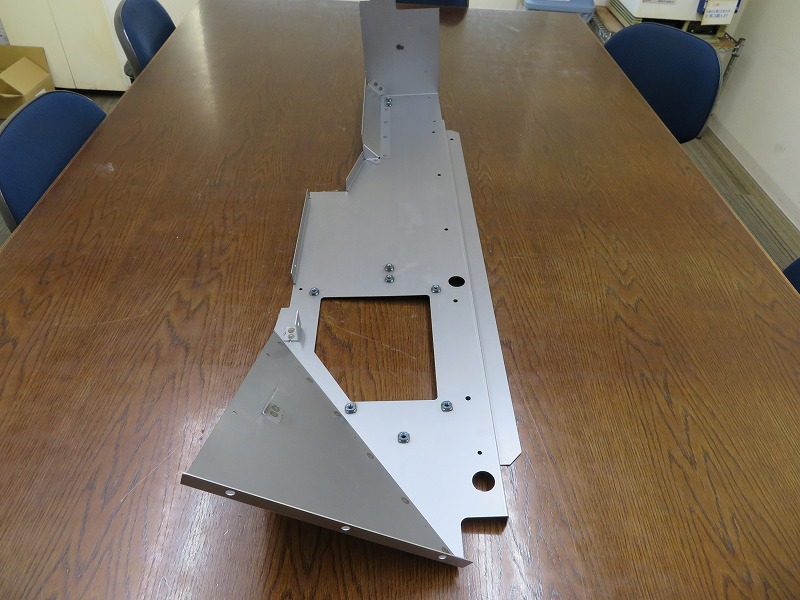 5点の部品で構成されており、要求仕様や形状の観点から、全てファイバーレーザー加工機で抜き加工を行います。その後に曲げ加工を行い、さらに2点の部品についてはプロジェクション溶接にてナットを付けます。そして、5点の部品をズレの無い様に慎重に結合させていきます。