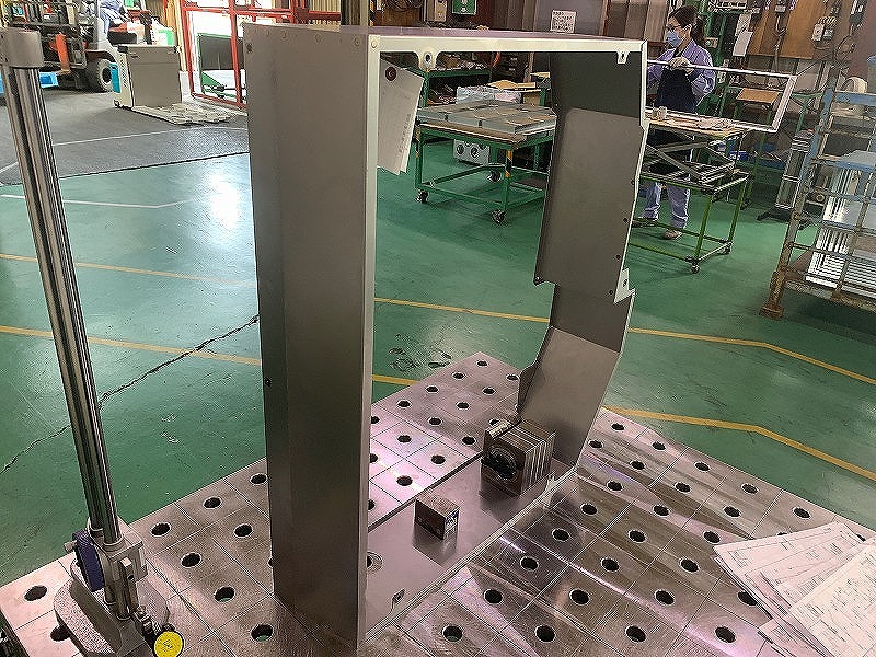 この精密板金加工品は農業機械(コンバイン)の可動部のフレームです。加工工程は、レーザーによるブランク加工、ロボットベンダーおよび人の手による曲げ加工、スポット溶接(ナット、組付け)です。単純な曲げの部分については、本製品が1ロット200個にせまるくらいのロット数であることから、ロボットベンダーを用いて高い生産性にて曲げ加工を行っております。その一方で、この製品は4つの板金製品で構成されており、また曲げの角度は鈍角が多く、縁においては曲げた各々の板を合わせる必要がある為、そのように組立精度が求められるような箇所については、人の手によるベンダー作業を行うことで高精度な仕上がりを実現しております。精密板金加工 配線組立.comでは、この精密板金製品のような曲げの角度、曲げ合わせについて対応しておりますので、お気軽にお問い合わせ下さい。