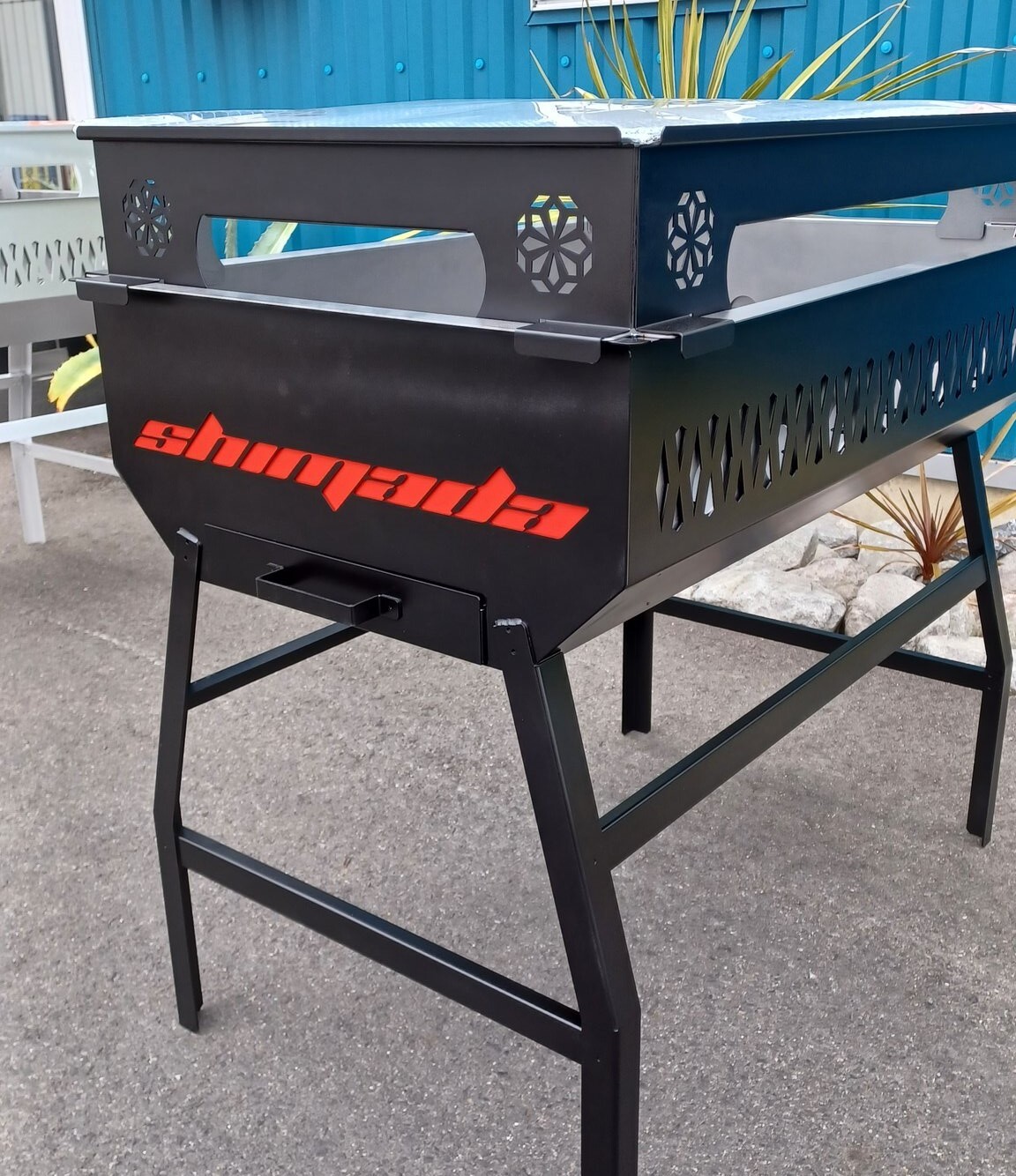 側面の装飾は、レーザー加工による抜きで表現しました。燃焼に必要な空気が十分に取り込めるよう、側面には格子状の隙間を設けました。正面側と側面側は溶接で接合しており、合わせ部分のずれが生じないよう、丁寧に製作しています。足部はアングル材を溶接して成形しました。