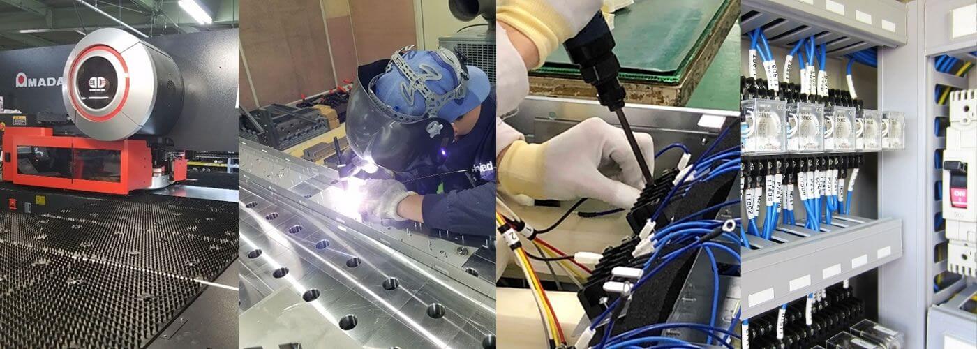 一般に板金加工工場は簡単な組立のみを担当することが多く、配線まで担当することは少ないですが、これらの工程を島田工業では一工場で行うことで、モデルチェンジの際などに設計変更提案等、より良い製品になるようなご提案を行っています。 具体的には、形状追加による組立の位置決め改善(ひいては組み立てコストの低減)や、メンテナンス性向上につながる部分的な形状変更、梱包方法の変更による輸送コスト低減などが実績としてあります。 今ホームページをご覧頂いてるお客様におかれましても、是非一度島田工業の工場見学やお見積り依頼、ご相談等を検討いただければと思います。